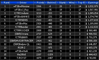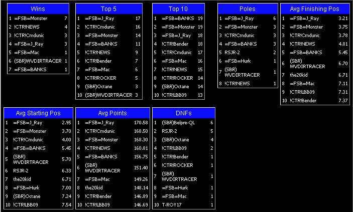 =FSB=J_Ray finished in the runner-up spot and the Rookie of the Year, !CTR!Cmdunic rounded out the top 3. Fellow rookie =FSB=Banks came in 4th. By winning the final 3 races, !CTR!NEWS snuck into the top five.