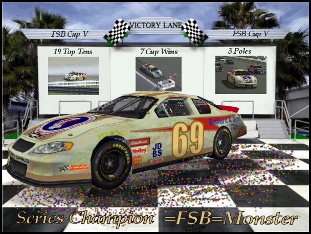 Our fifth season came to a close with =FSB=Monster hanging on for his second career points championship. His 7 Cup wins led the league and he finished every race he started except one. Good job Monster, you are officially the man!